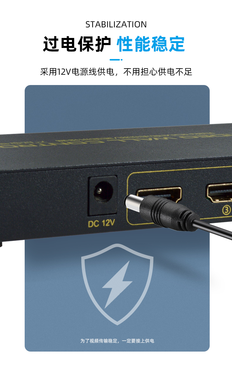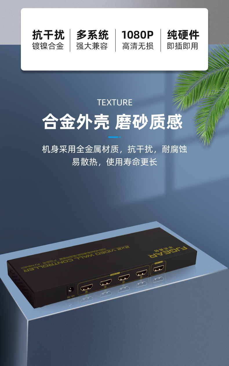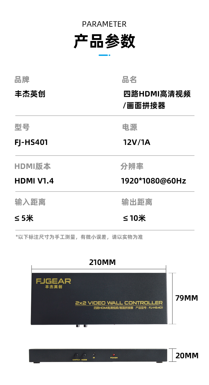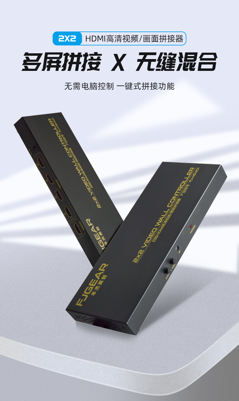 FJ-HS401產(chǎn)品是一款四路HDMI高清視頻/畫面拼接器,由1路HDMI高清視頻信號輸入到拼接器,拼接器對視