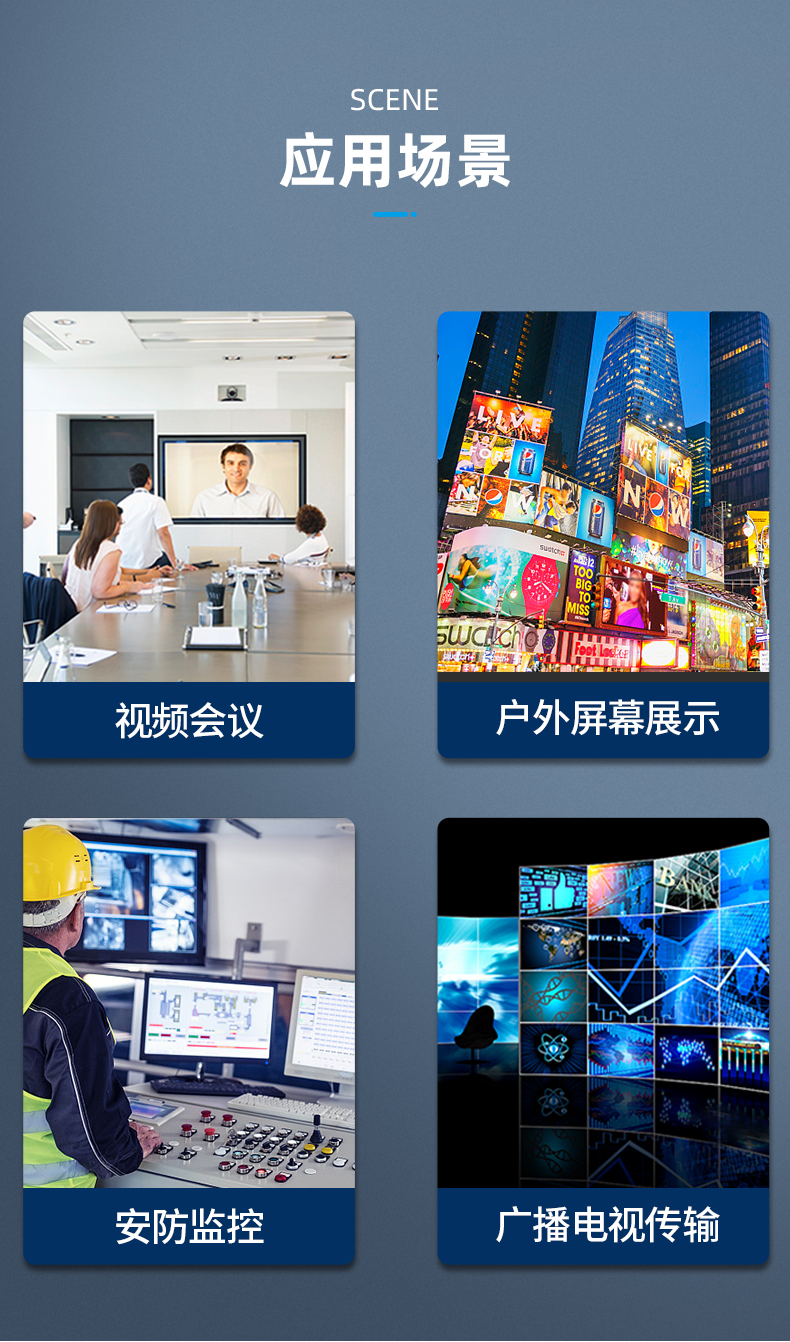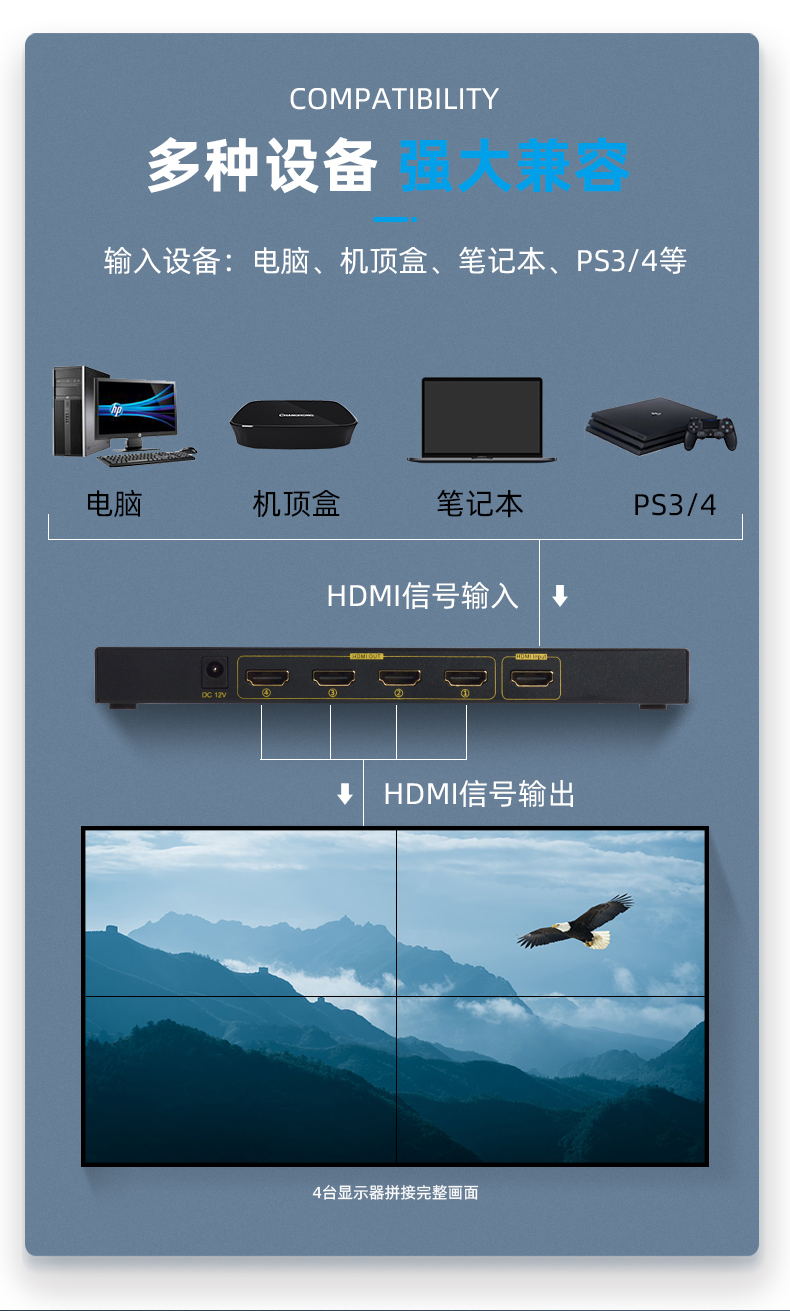 頻處理后輸出并傳輸?shù)接脩糁付ǖ?-4個顯示屏上,拼接起來即可組合成一個大型顯示屏,具有畫質(zhì)清晰,響應(yīng)速度