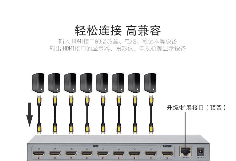 八路HDMI輸入信號的組合模式和輸出方式,大大的提高了工作效率和節(jié)省了設(shè)備的成本投入;他廣泛應(yīng)用于安防,教育,影音