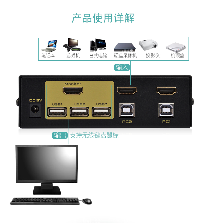 ? 一組USB控制端可管理2臺(tái)HDMI接口電腦及2臺(tái)USB接口設(shè)備;