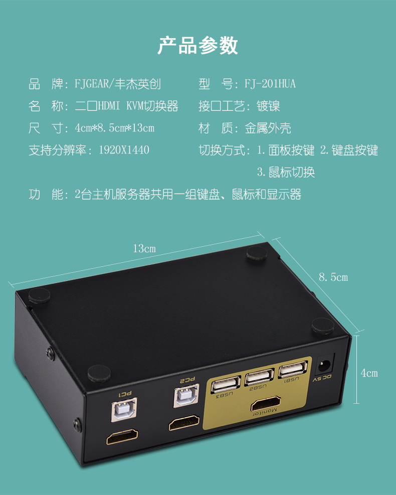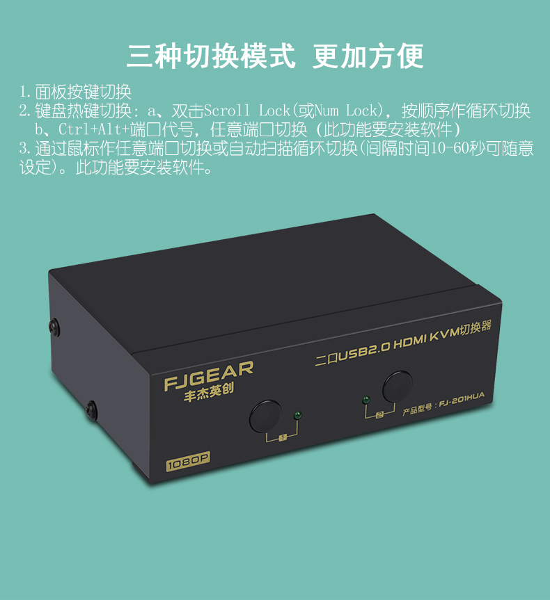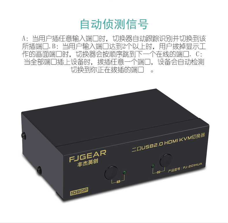 FJ-201HUA整合2端口KVM多電腦切換器,該款產(chǎn)品支持2臺(tái)電腦之間或是共它設(shè)備如游戲的HDMI信號(hào)切換,并讓使用者從單一控制端分享USB接口設(shè)備FJ-201HUA提供先進(jìn)的獨(dú)立切換功能,使用者可通過(guò)前端面板按鍵及鍵盤(pán)熱鍵進(jìn)行功能切換,該款產(chǎn)品同時(shí)具備顯示器動(dòng)態(tài)同步顯示技術(shù),可保持最佳HDMI顯示器顯示分辯率。