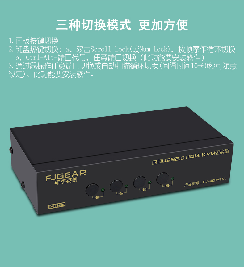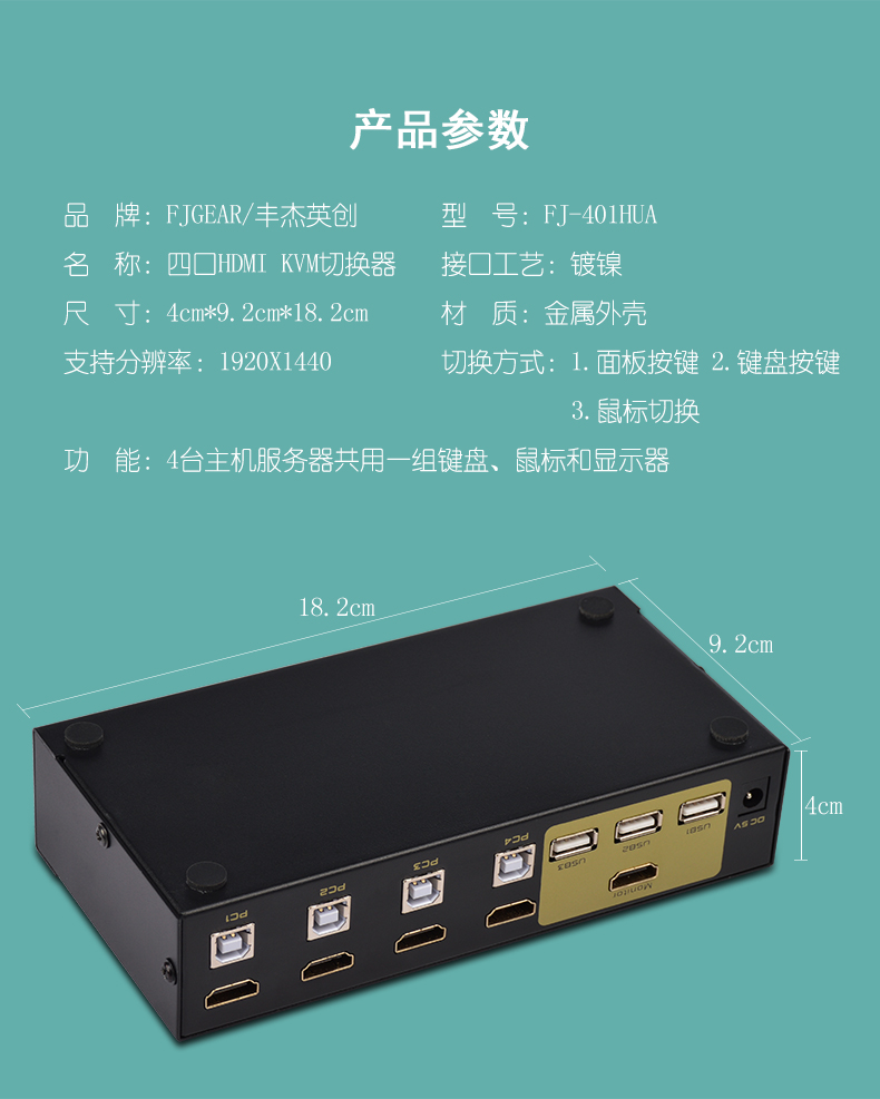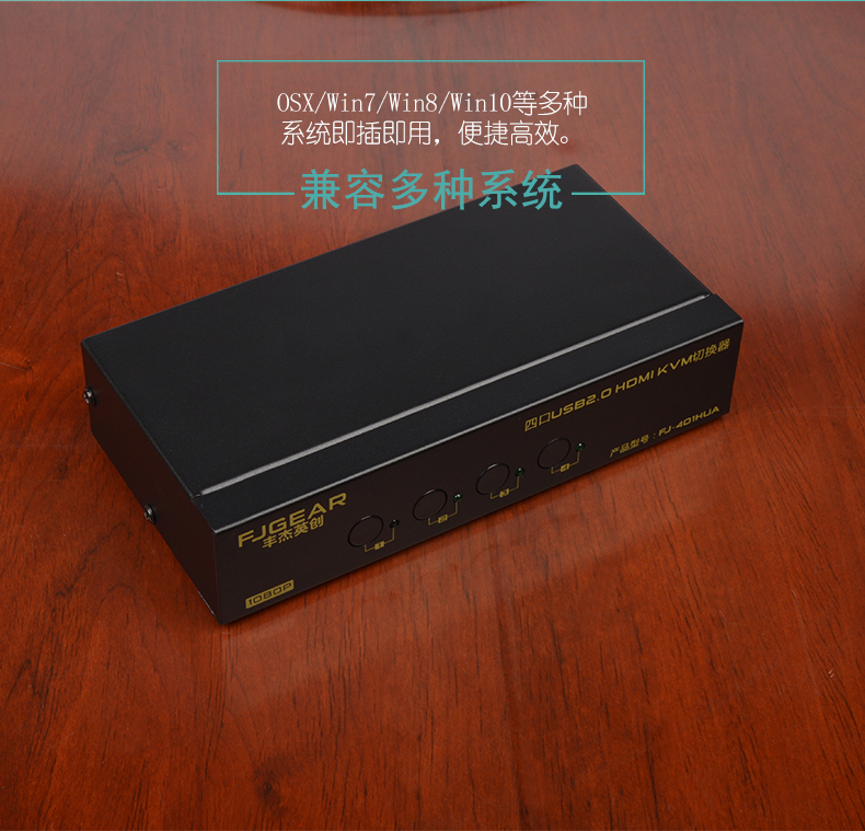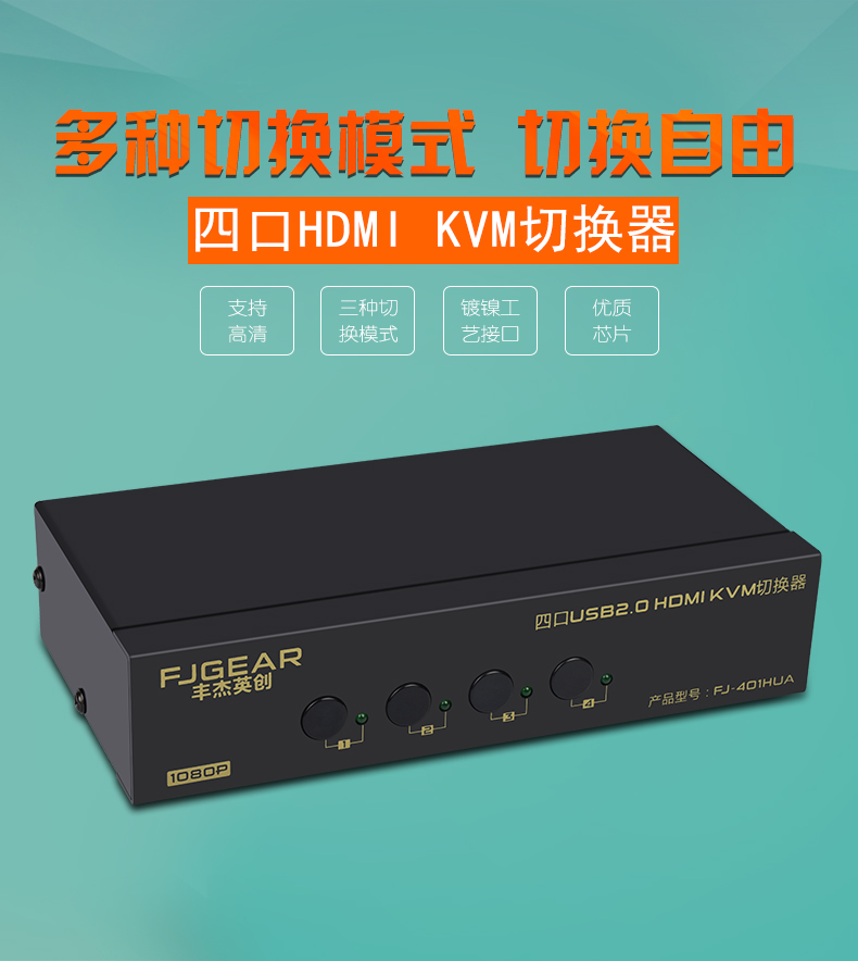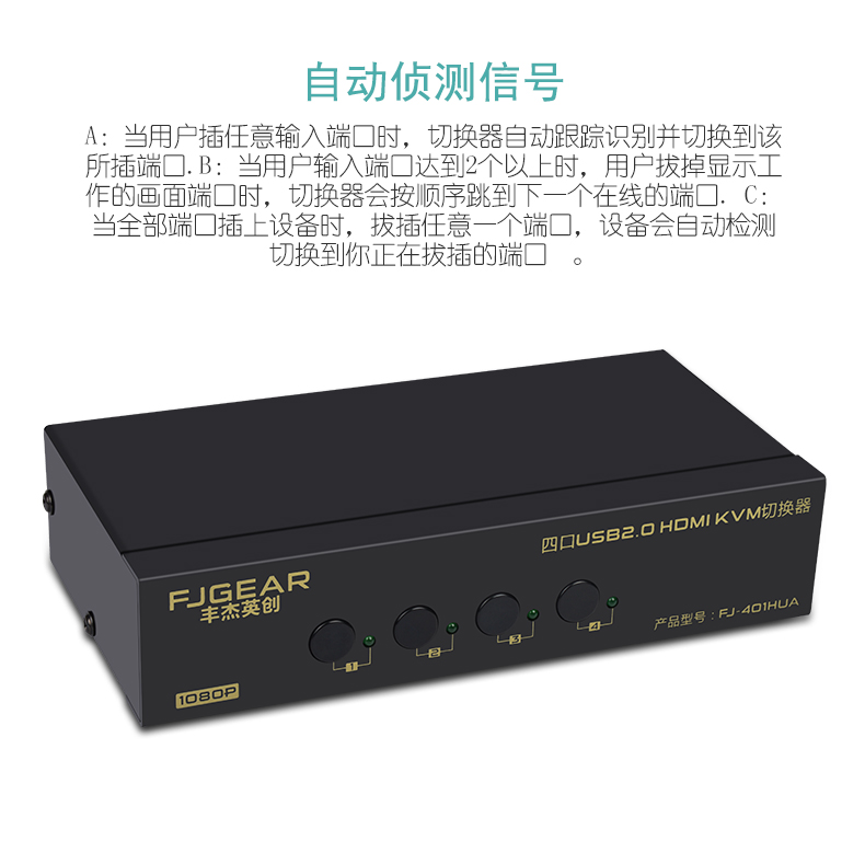 FJ-401HUA整合4端口KVM多電腦切換器,該款產(chǎn)品支持4臺(tái)電腦之間或是共它設(shè)備如游戲的HDMI信號(hào)切換,并讓使用者從單一控制端分享USB接口設(shè)備FJ-401HUA提供先進(jìn)的獨(dú)立切換功能,使用者可通過(guò)前端面板按鍵及鍵盤(pán)熱鍵進(jìn)行功能切換,該款產(chǎn)品同時(shí)具備顯示器動(dòng)態(tài)同步顯示技術(shù),可保持最佳HDMI顯示器顯示分辯率。