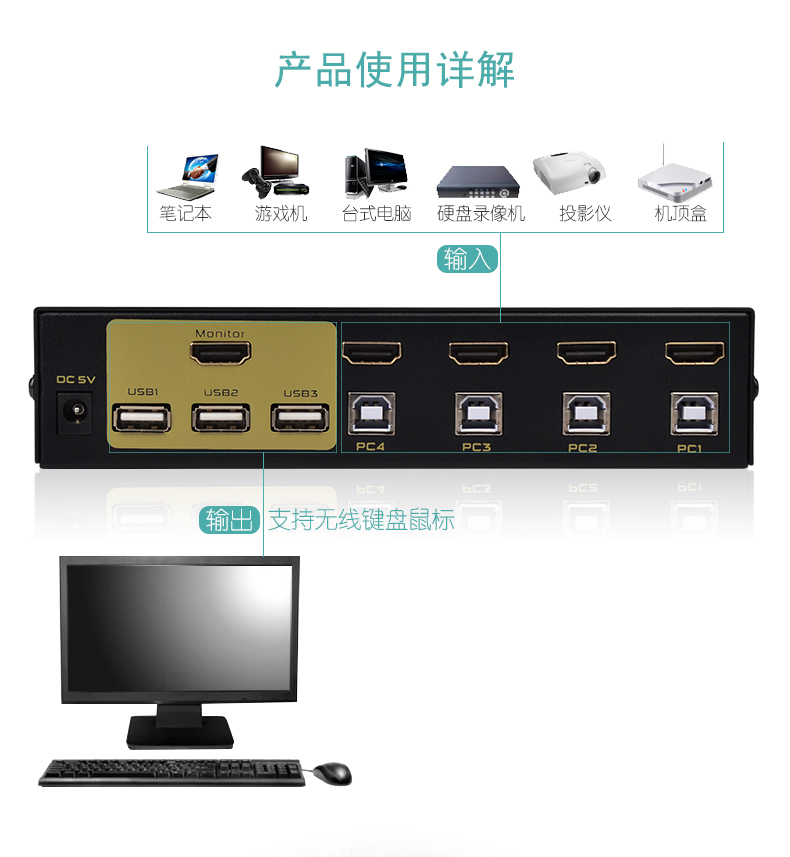 ? 一組USB控制端可管理4臺(tái)HDMI接口電腦及4臺(tái)USB接口設(shè)備;