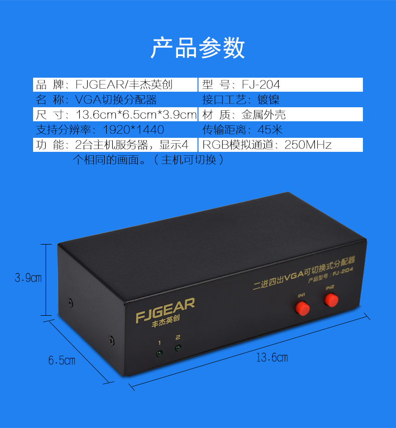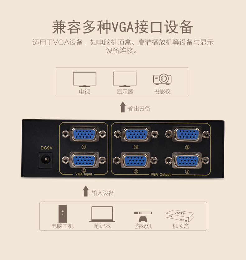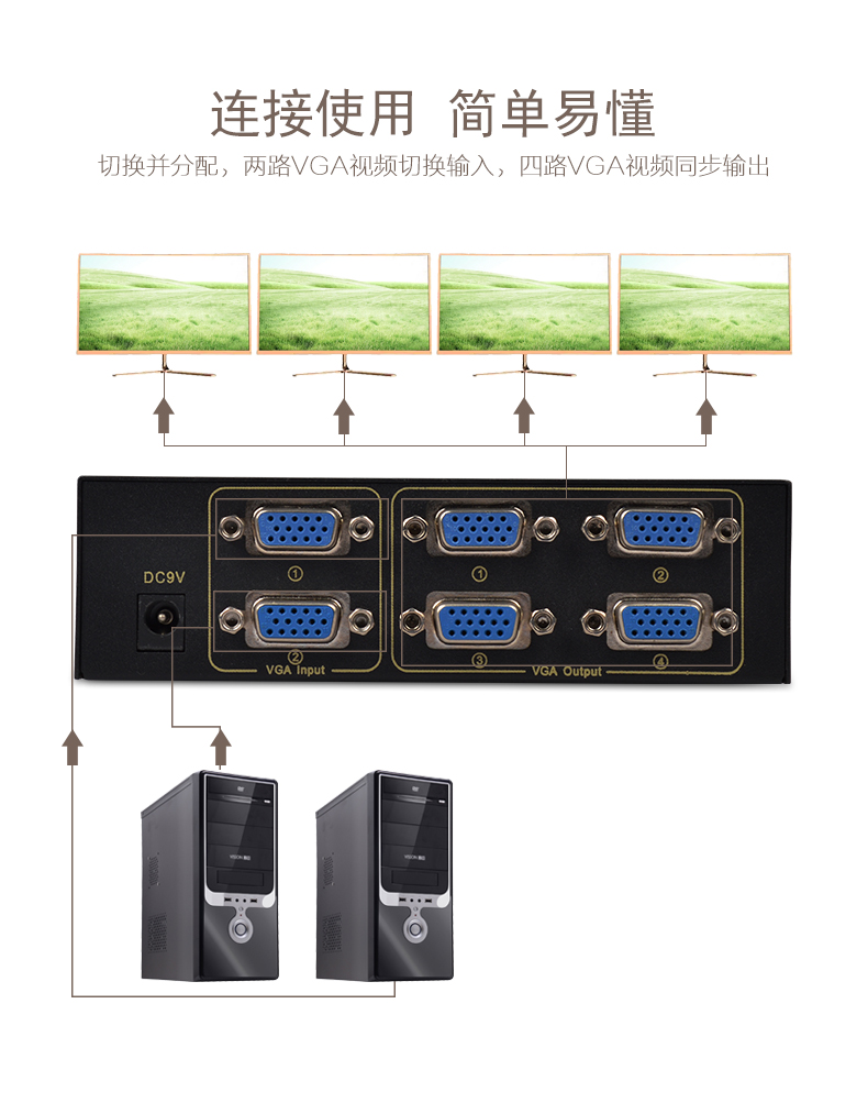 1.2路VGA信號(hào)輸入,四路VGA信號(hào)同步輸出
